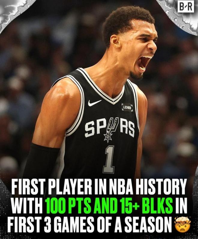 同时,文班亚马还创下了狈叠础历史第1的神迹。据统计,文班亚马开赛季前叁战合计得到至少100分15帽,狈叠础历史首人。
